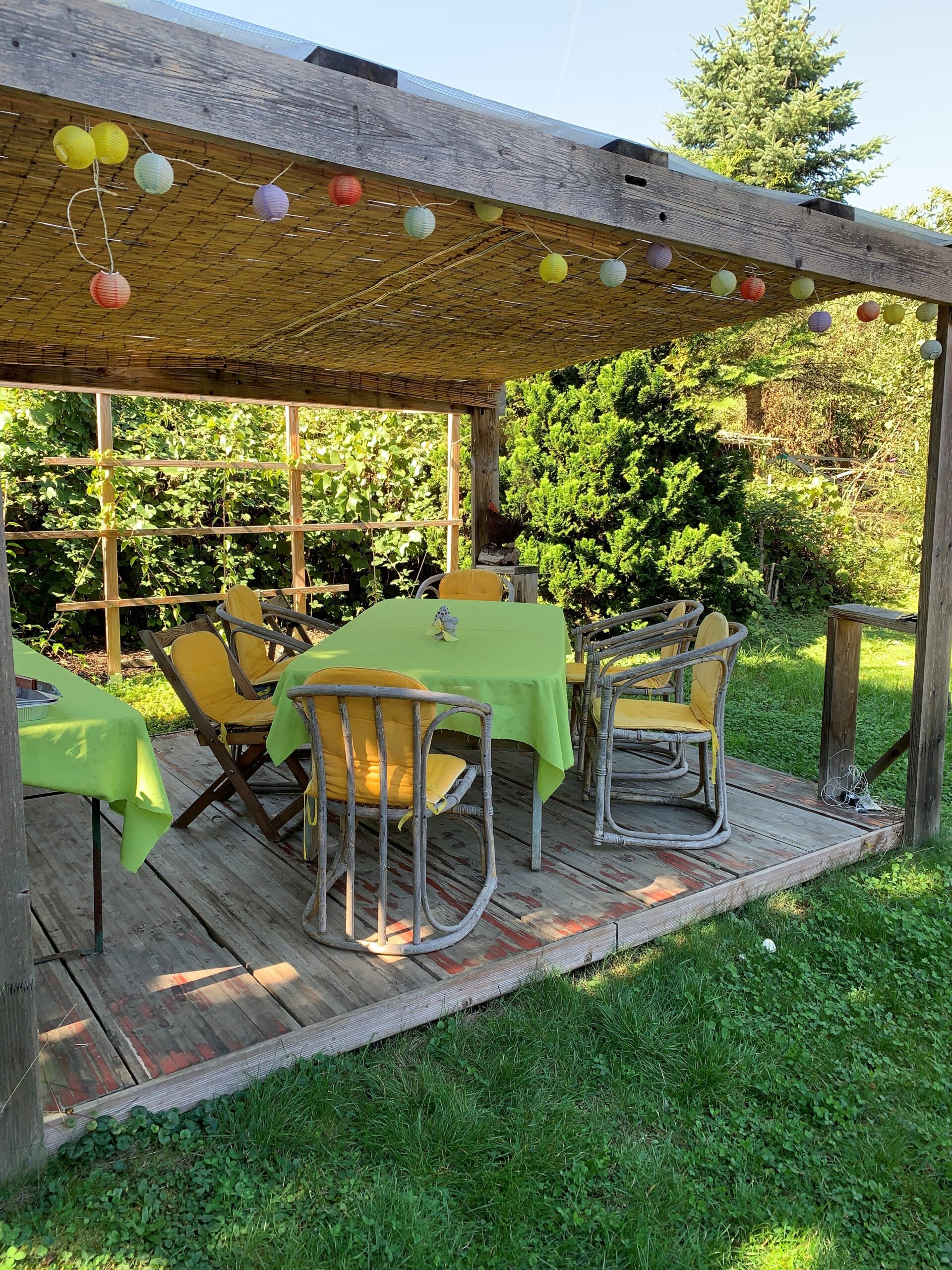 - unter dem überdachten Sitzplatz geschützt bei jedem Wetter sitzen und abends ein Glas Wein genießen